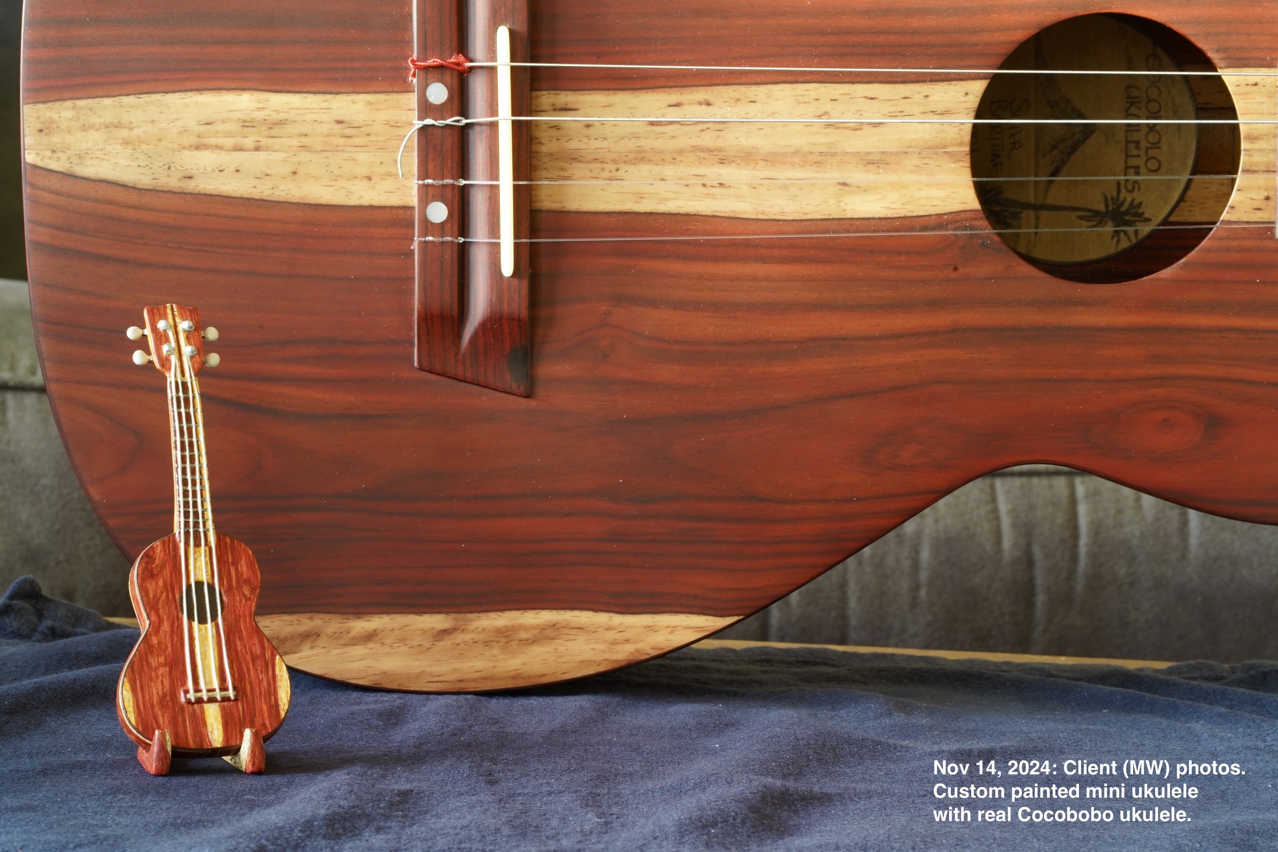 -November 2024 photos: Client (MW) photos of CocoBolo Wood painted Mini Soprano Ukulele Model with his real Nicaragua Cocobolo Wood Baritone Ukulele.