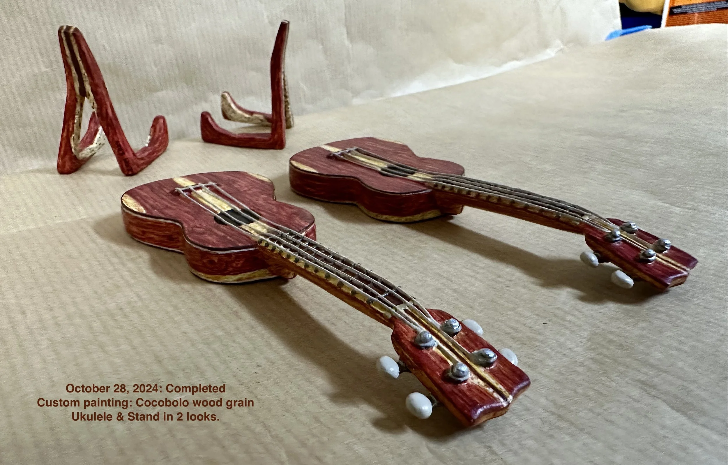 -September/October 2024: Completed and In Progress photos of custom orders for CocoBolo Wood painted Mini Soprano Ukuleles to match close to the Client’s Nicaragua Cocobolo Wood Baritone Ukulele.