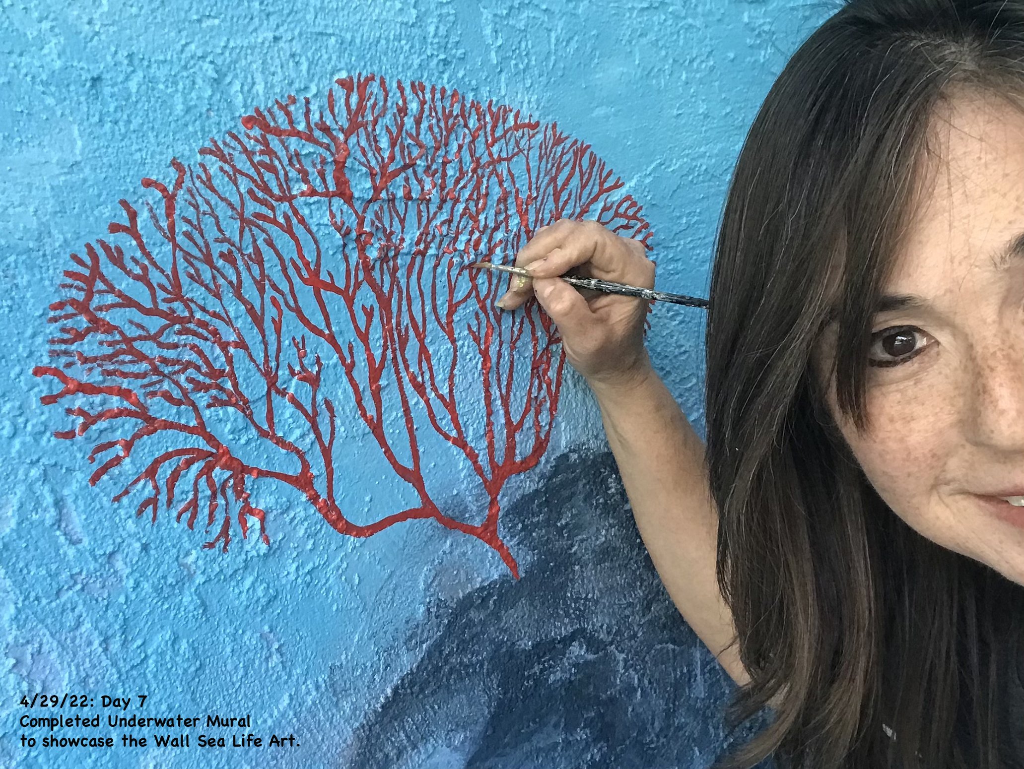 Elizabeth Koval Maffeo created an underwater sea scape mural to showcase the client’s wall sea life art. On location at a private residence, Liz hand painted an underwater theme on stucco surface. Focusing on changing the background, adding a variety of kelp, corals, starfish, sea shells, octopus, and a fish couple. Including hand painting names in English and in Greek.